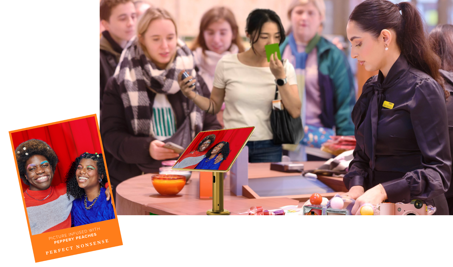 Imagine a fragrance testing station that sparks unexpected connections. Snap a shot with a friend or a stranger using one of our Polaroid cameras and take home a memory that’s more than just a photo. Each print doubles as a scent tester, infused with one of the Perfect Nonsense fragrances, making every moment a perfect blend of scent and spontaneity.